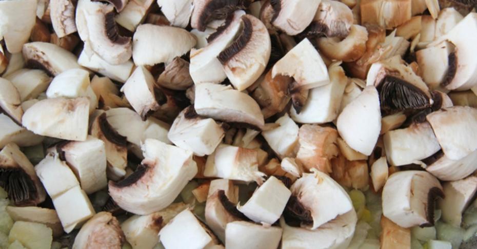 1. Пассируем мелко нарезанную луковицу на разогретом масле. Споласкиваем шампиньоны, снимаем пленочку со шляпок, нарезаем грибы и высыпаем жариться к луку. Солим. Жарим шампиньоны до выпаривания воды и легкого золотистого цвета.