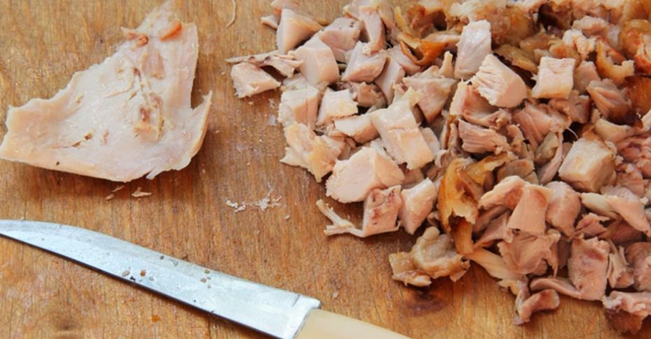 2. Отвариваем яйца 7 минут, очищаем и натираем на крупной терке. Промываем чернослив, оставляем на некоторое время размокать в воде, затем мелко нарезаем. Споласкиваем 200 г огурцов, крупно натираем. Нарезаем небольшими кусочками копченую курицу.