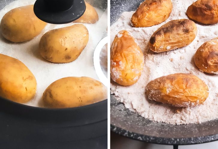Картошку как на костре можно приготовить и на плитеРецепт прост: насыпаем на сковородку соль, чтобы получился слой высотой не менее 2 см.