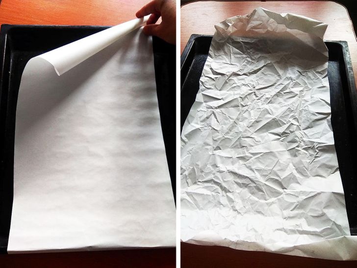 Чтобы пергамент для выпечки не скручивался на противне, его достаточно смять, а потом расправить