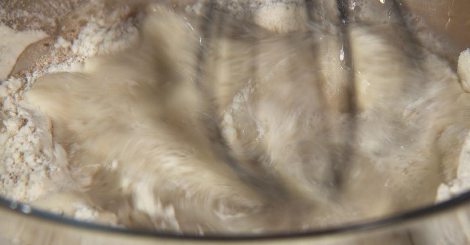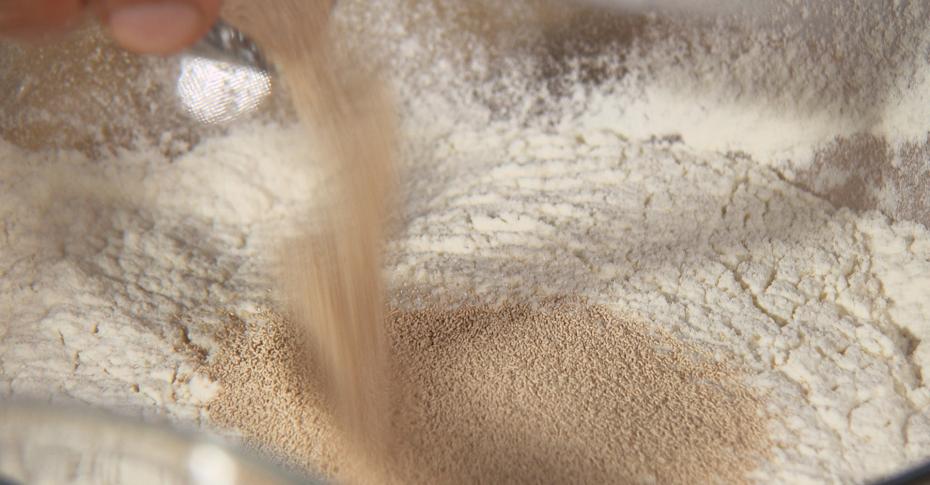 2. Добавьте к ней дрожжи, сахар, соль и немного воды.